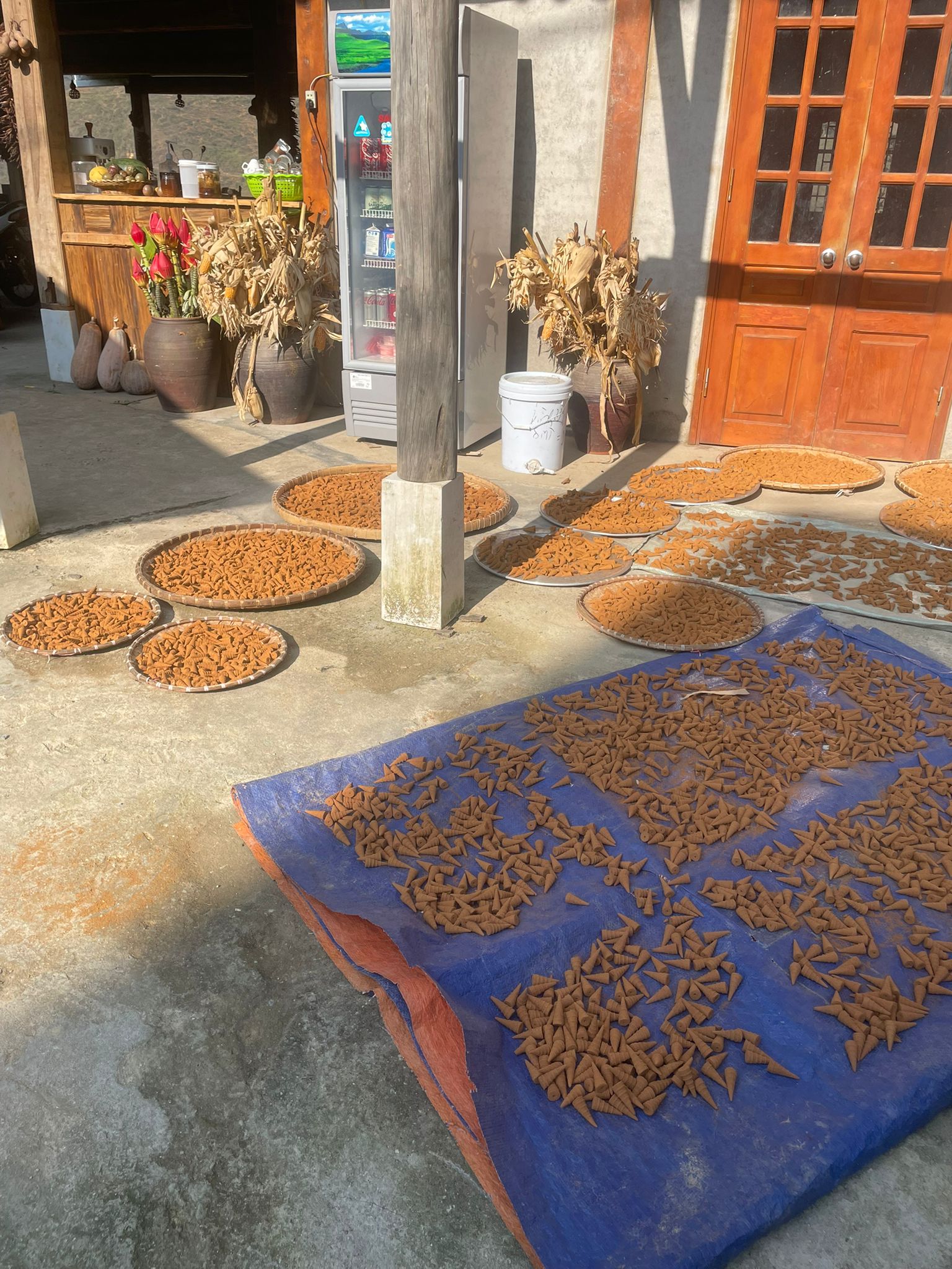 Siamo poi arrivate in un primo villaggio etnico, dove abbiamo osservato le donne lavorare davanti alle loro case. Questo ci ha permesso di scoprire i saperi tradizionali della popolazione locale: il ricamo e la tessitura, la tintura naturale all’indaco, così come l’antica tecnica del batik a cera, che consiste nel disegnare motivi con la cera d’api prima di tingere il tessuto. Abbiamo anche visitato un laboratorio dotato di macchine tradizionali in legno utilizzate per la tessitura, la produzione della farina e la sbramatura del riso, spesso grazie a sistemi azionati dall’acqua. Dopo aver costeggiato le risaie, attraversato abitazioni locali e incontrato numerosi animali, siamo arrivate all’ingresso di un altro villaggio, punto finale del nostro trekking. L’autista è arrivato rapidamente per venirci a prendere e riportarci al nostro ostello a Sapa.